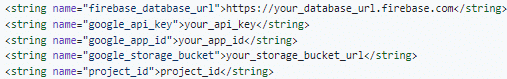 • Now Change the values of firebase_database_url  , google_api_key , google_app_id , google_storage_bucket , project_id You will get all the values in google-services.json file which you downloaded before.